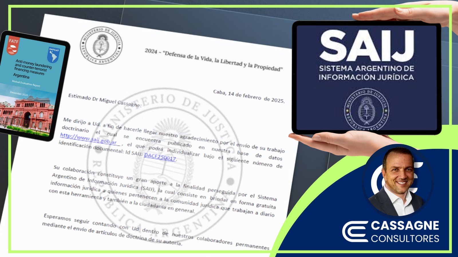 En respuesta al reconocimiento otorgado a Miguel Cassagne, por parte del Ministerio de Justicia de la Nación, a través del Sistema Argentino de Información Jurídica (SAIJ), desde CASSAGNE Consultores expresamos nuestro más sincero agradecimiento a SAIJ por el interés en publicar, en el sector de doctrina de su plataforma Infojus, el artículo de actualidad escrito por nuestro titular, titulado previamente por la revista jurídica Mercojuris: "Argentina fuera de la Lista Gris del GAFI pero en estado de Supervisión Reforzada: Contexto e Implicancias".