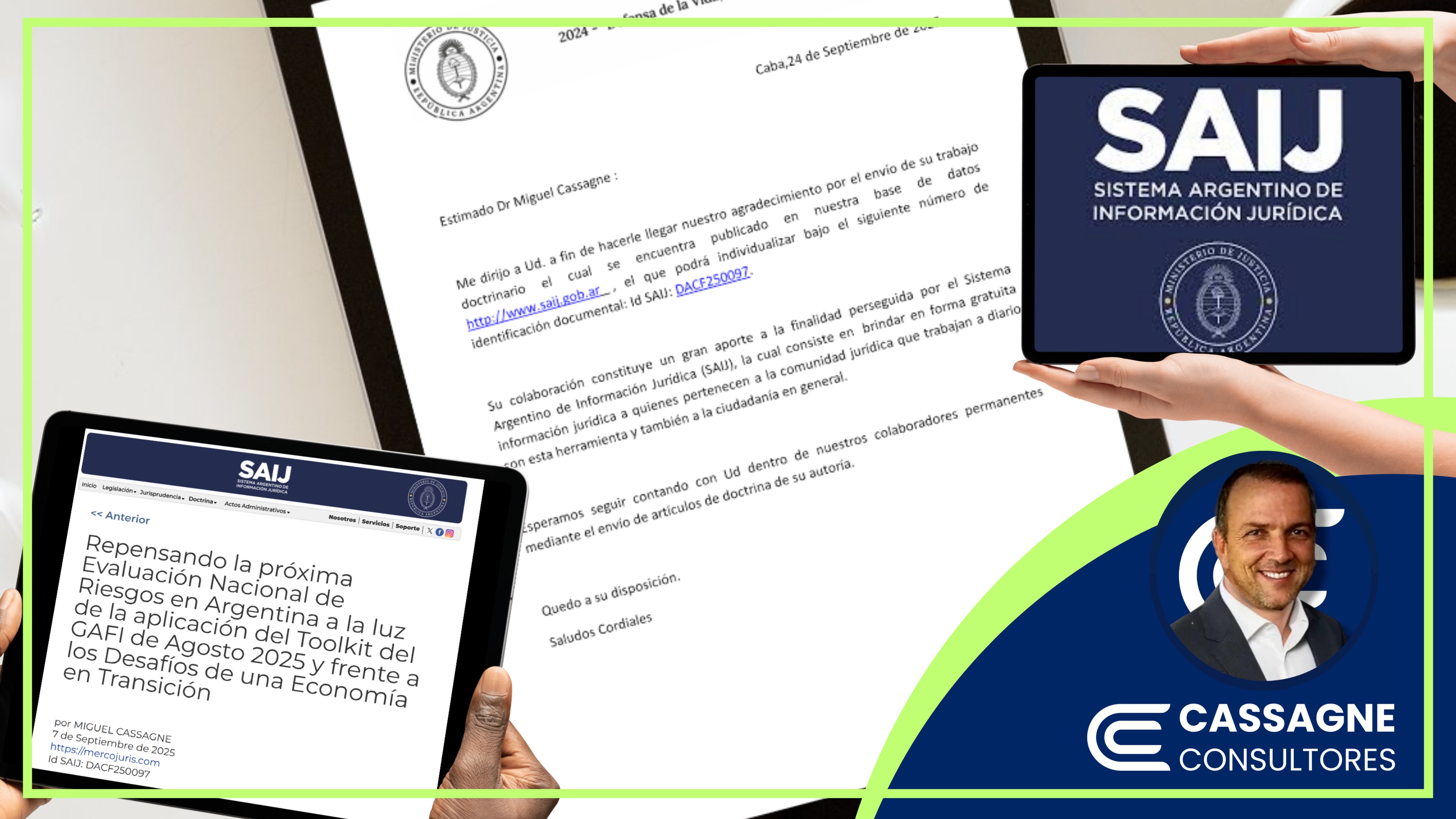 En continuidad con los reconocimientos previos, agradecemos al Ministerio de Justicia de la Nación por la reciente publicación en el Sistema Argentino de Información Jurídica (SAIJ) de un nuevo trabajo doctrinario de nuestro titular, Miguel Cassagne, titulado: ?Repensando la próxima Evaluación Nacional de Riesgos en Argentina a la luz del Toolkit del GAFI de agosto 2025 y frente a los desafíos de una economía en transición?.