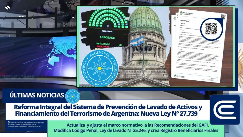 CASSAGNE Consultores informa a clientes y seguidores que hoy se publicó en el Boletín Oficial la Ley 27.739, que actualiza y ajusta el marco normativo argentino en materia de PLAFT, considerando la evolución del sistema en el tiempo y las modificaciones que sufrieran los estándares internacionales del Grupo de Acción Financiera Internacional (GAFI). ?